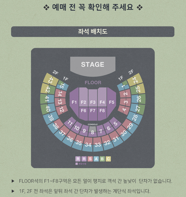 | F1,6,7,5 | 고개를 자주 들어야 함. 앞사람 키에 따라 관람 차이 |