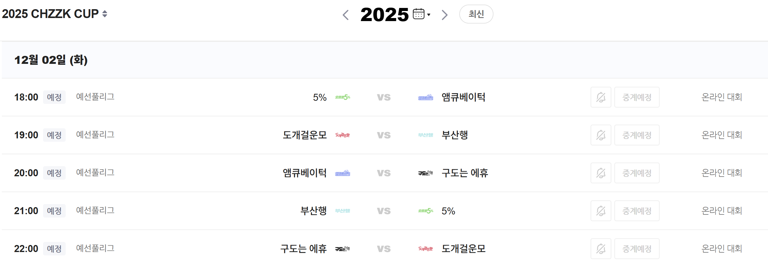 - 2025 치지직컵 예선 일정(11월 29일~12월 2일) 저녁 6시 미리 캘린더 체크